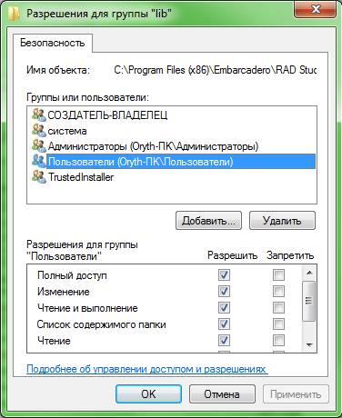 Примечание: если у вас установлена операционная система Windows 7. Вам так же необходимо произвести некоторые действия, чтобы успешно все компилировалось. Для начала вам необходимо выделить папку “\lib” кликнуть на ней правой кнопкой мыши. В контекстном меню выбрать «свойства» снять галочку «только для чтения». Потом выбрать закладку «безопасность» нажать кнопку «изменить». Появится окно «разрешения для группы «lib»». В этом окне выбрать пользователи и разрешить полный доступ и нажать кнопку применить (смотрите рисунок ниже).
