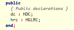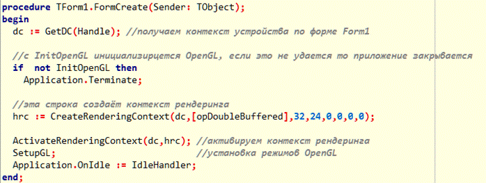 hrc : HGLRC — контекст рендеринга, он необходим для OpenGL, чтобы рисовать на форме Инициализацию необходимо производить непосредственно при создании формы. Таким образом, следующий код должен быть в событии OnCreate формы: