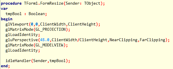 end; Так как OpenGL выводится на форму, то при изменении её размеров, изменяется и выход изображения OpenGL, и не которые части могут скрыться, чтобы этого не происходило, необходимо среагировать на событие OnResize и она будет следующей.