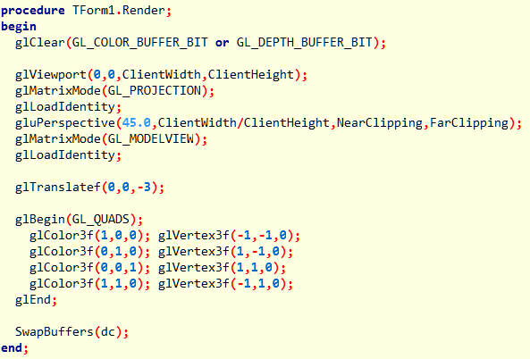 После этой совершенно простой инициализации (можно, конечно, делать все вручную, с помощью стандартных функций Delphi,и определять формат пикселя, но это делается дольше, а с InitOpenGL все это делается проще и быстрей), вы имеете сразу в распоряжении все особенности OpenGL, которые определенны в начальных значениях. Но часто, определенные параметры по умолчанию в OpenGL не будут использоваться или их